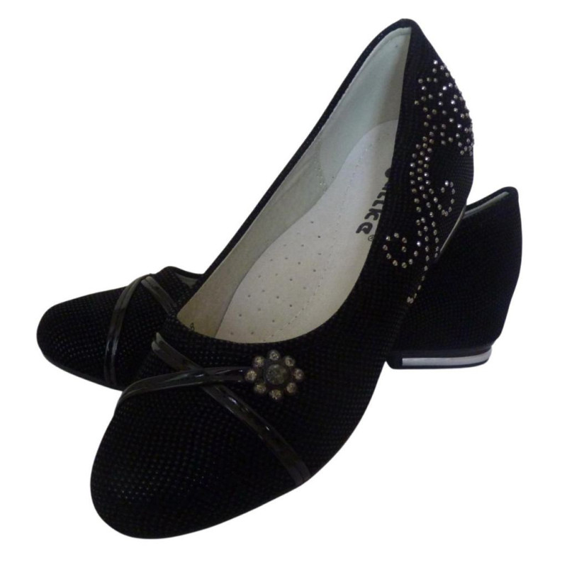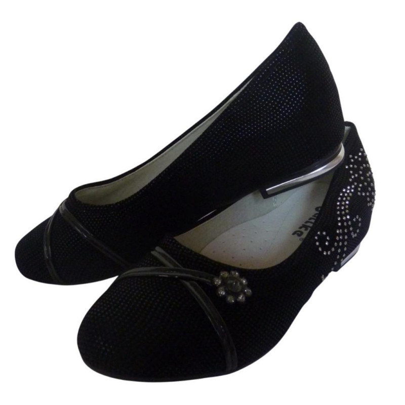 Верх – комбинированные материалы (замш с напылением, лаковый кожзаменитель, стразы), внутри - кожаная стелька с супинатором.